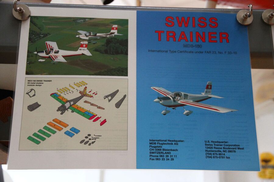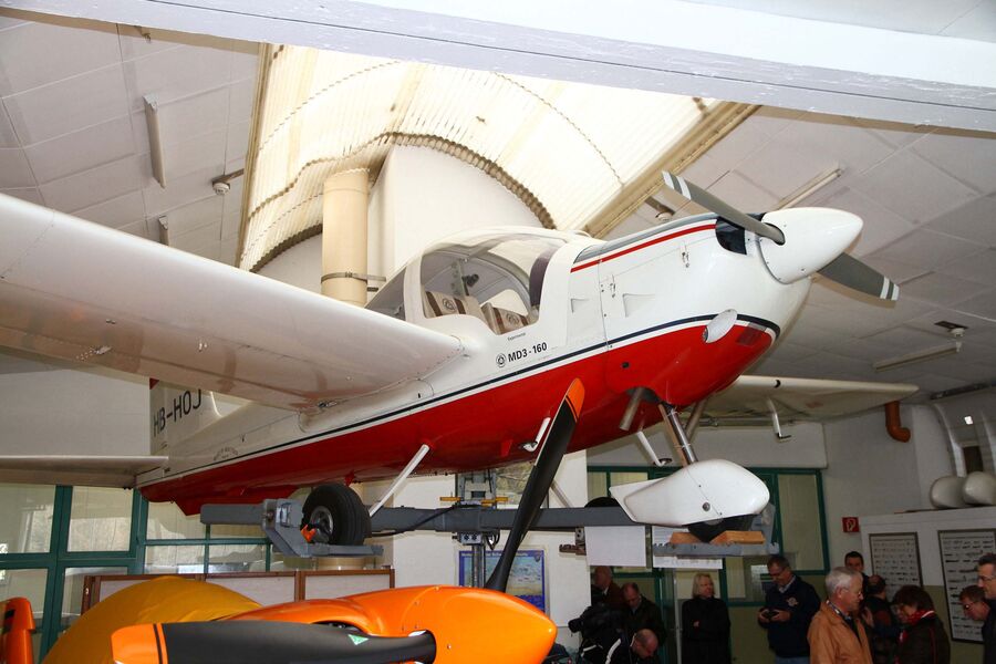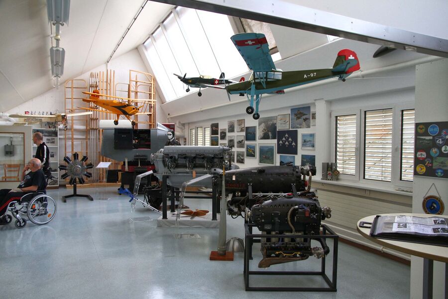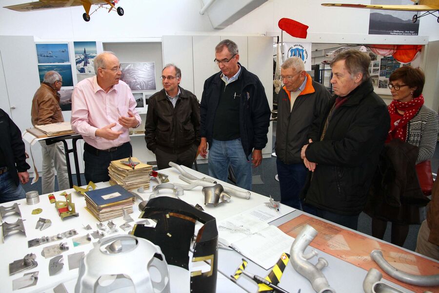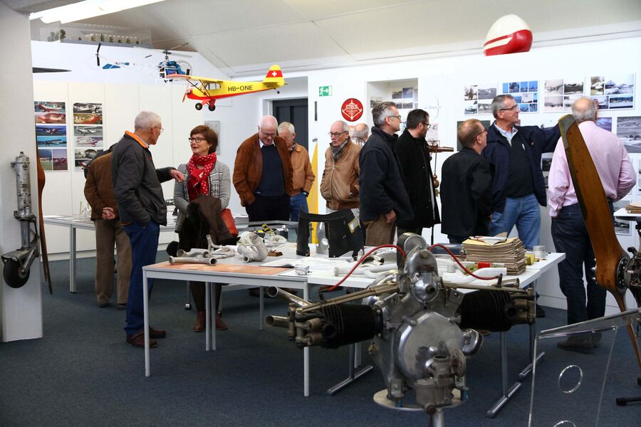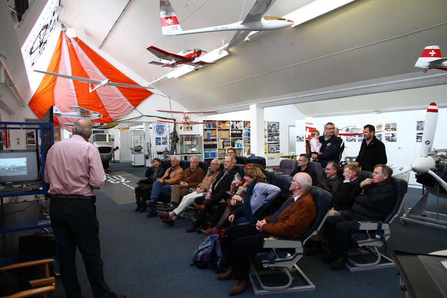 Nach etwa einer Stunde kam für unsere Gruppe das eigentliche Museum und ein weiterer Hangar neben den Fabrikationsräumen an die Reihe. Mit grossem Interesse verfolgten wir im Hangar die Ausführungen zu dem im Hause Dätwyler entwickelten Mitteldecker Dätwyler MD3-160 SWISS TRAINER, ein modular aufgebautes Trainings-, Reise- und Akrobatikflugzeug. In separaten, hellen Ausstellungsräumen werden bekannte Motoren, Memorabilien zur Schweizer Aviatikgeschichte, Interessantes über die Pionierzeit der Fliegerei im Oberaargau und vieles mehr anschaulich präsentiert. Ein Ausstellungsabteil widmet sich der Luftwaffe und der Swissair.